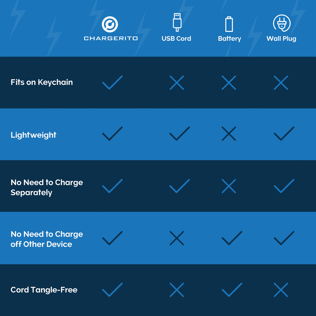 Every time you leave the house, you make sure you have your phone, wallet, and keys. Now with Chargerito on your keychain you'll also always have a charger. Everyone already has a charger in their home, workplace, and car, but what about all those unexpected scenarios where you find yourself with low battery and no easy way to charger your phone? Since Chargerito is always with you, never worry about running out of battery at the wrong time.